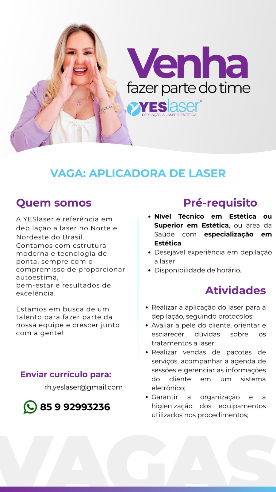 Se você se encaixa no perfil (ou conhece alguém que se encaixe), envie seu currículo para: vagas@yeslaserbrasil.com ou entre em contato pelo WhatsApp: 85 99299-3236