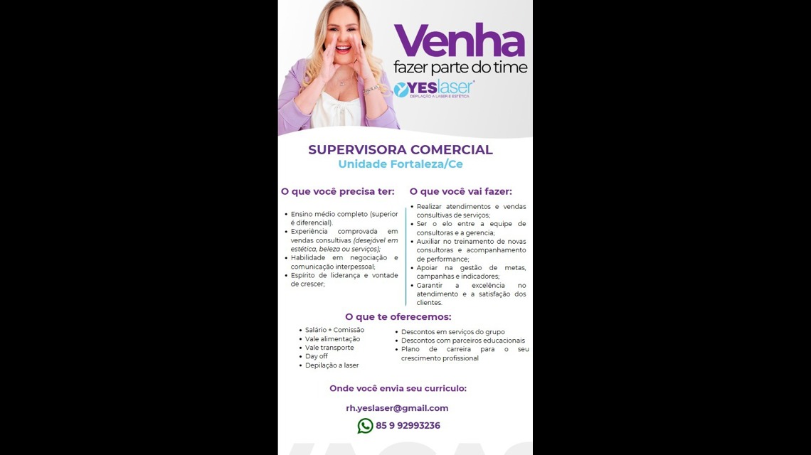 Uma líder inspiradora, com brilho nos olhos, foco em resultados e paixão por pessoas e estética. Alguém que vista a camisa da marca e tenha sede de crescimento junto com a Yeslaser! 💜